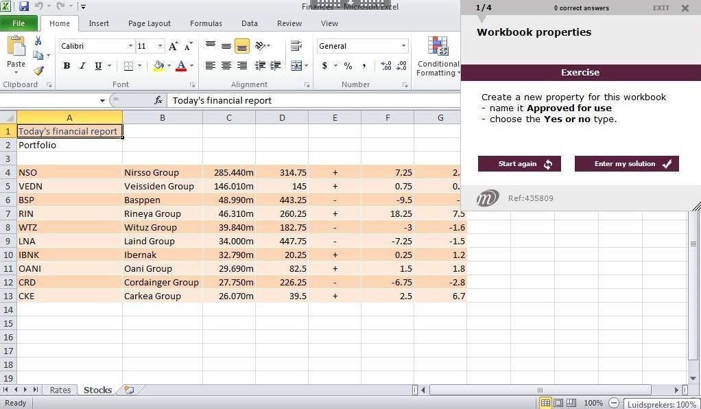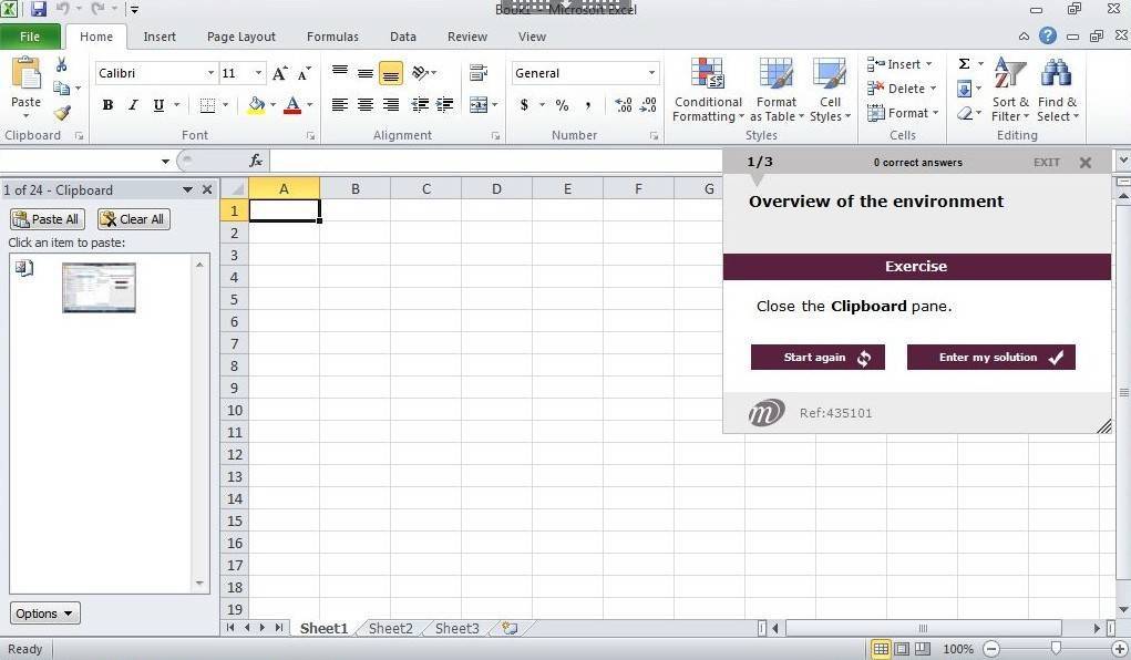 Discover Excel, work with a simple tableDiscover Excel and carry out simple tasks: opening a workbook saving it, entering and modifying data etc…You need to know: About your spreadsheet applicationOverview of the environmentOpening a workbook Moving around a workbookYou need to know: Text made easy Entering dataYou need to know: Selecting, copying, moving Selecting and deleting cellsUndoing and redoing an action Column width/row heightYou need to know: Saving files Saving a workbookModifying the contents of a cell