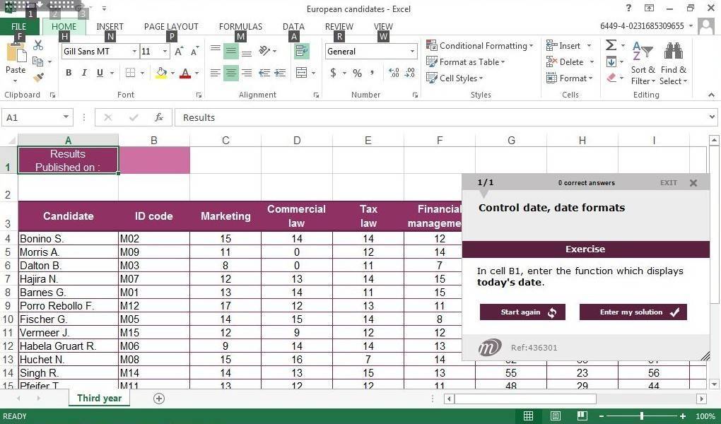 Displaying several lines of data in one cell Absolute reference in a formula Copying values, copying with a link You need to know: Calculating with functions Control date, date formats Simple conditions Custom formats Applying a conditional format Managing conditional formats Naming a range of cells Validation rules Multiple cell ranges and calculations in functions You need to know: Charts Creating and positioning a chart Managing a chart Selecting items in a chart Adding and removing items Formatting chart items Modifying a chart's text items Legend and plot area Printing and page layout of a chart Modifying data labels Data series and chart axes Managing series Chart type options Managing chart templates Creating a sparkline Managing sparklines Creating a drawing object Selecting and deleting objects Copying and moving objects Resizing a drawing object Modifying a text box Modifying a drawing Formatting drawing objects Inserting a picture Managing pictures Rotating and aligning objects Stacking and grouping objects Subtotal rows Creating and managing a table Presenting and sorting data in a table Automatic calculations in a table Automatic filtering Custom filters Blank cells and duplicates You need to know: Advanced filtering with a criteria range Criteria ranges Copying rows filtered using a criteria range Statistics with a criteria range You need to know: Flash Fill You need to know: Pivot tables and pivot charts Creating a pivot table Modifying a pivot table Selecting Defining the layout and the presentation of a pivot table Filtering and searching for data in a pivot table Pivot charts