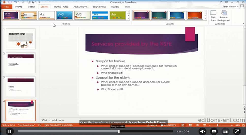 Managing chart templates Slide background Customising a theme The slide master Managing layouts Managing placeholders Formatting slide masters Using slide masters The notes master The handout master Custom slide shows Choosing the slides for the slide show You need to know: Styles and templates Creating and using a presentation template Presentation propertiesFinalising presentations Digital signatures You need to know: Versions and recovery of files You need to know: Customising the ribbon You need to know: The SharePoint site You need to know: Sharing a document over the internet You need to know: Best practice with a presentation program Comparing presentations Protecting a presentation with a password